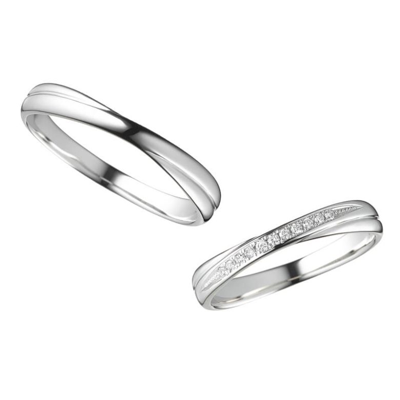 リング中央に流れる立体的なラインにダイヤモンドが配された、エレガントなデザイン。