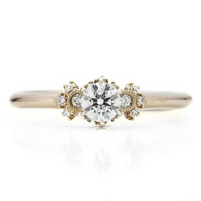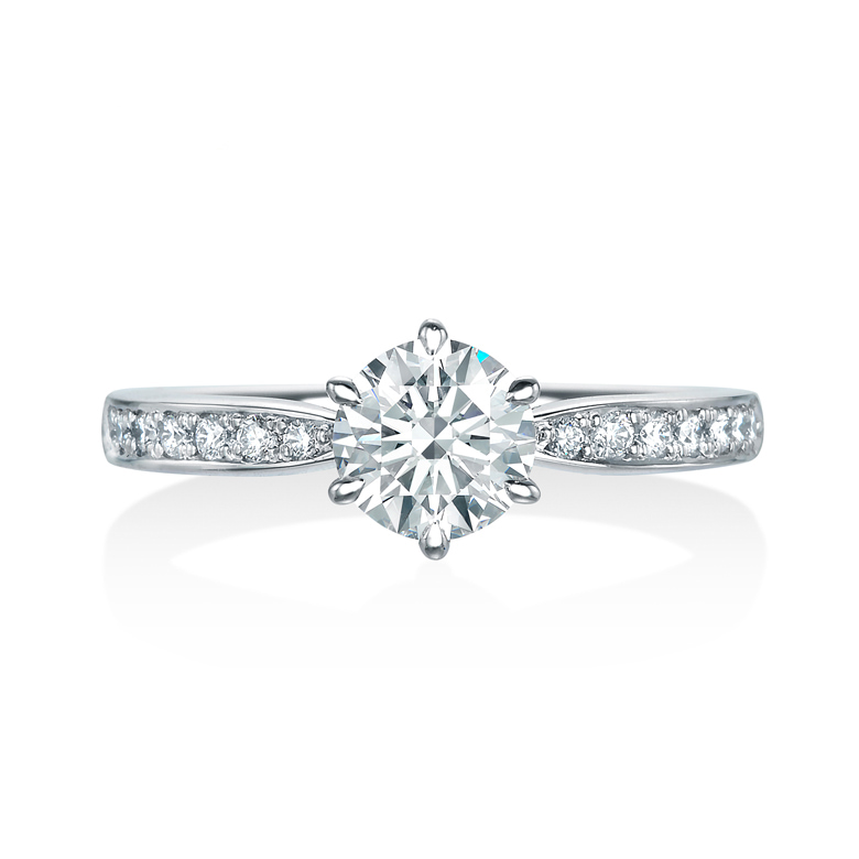 センターダイヤモンドの脇に小さなダイヤモンド(メレダイヤモンド)をあしらった可憐なデザイン。