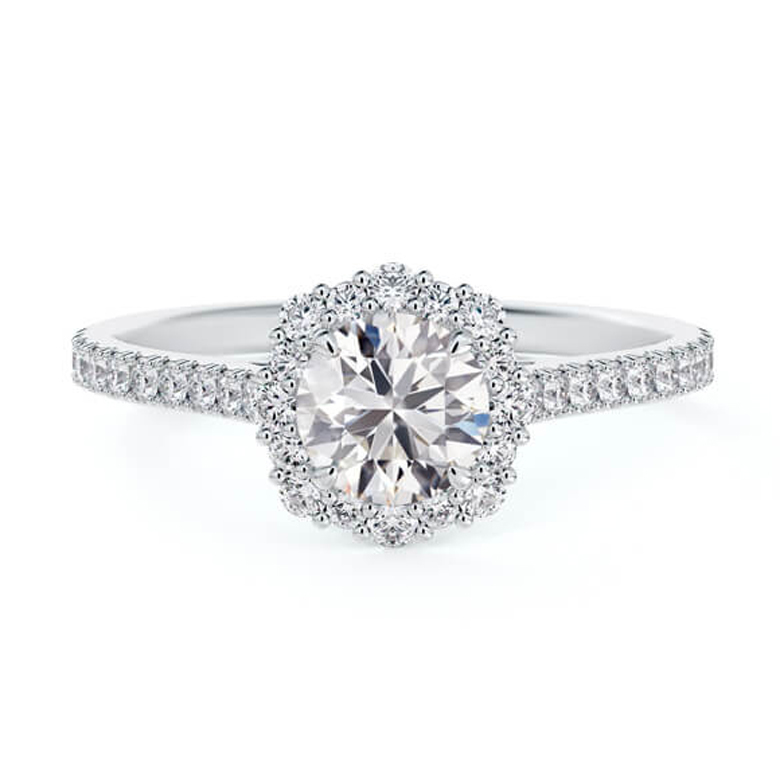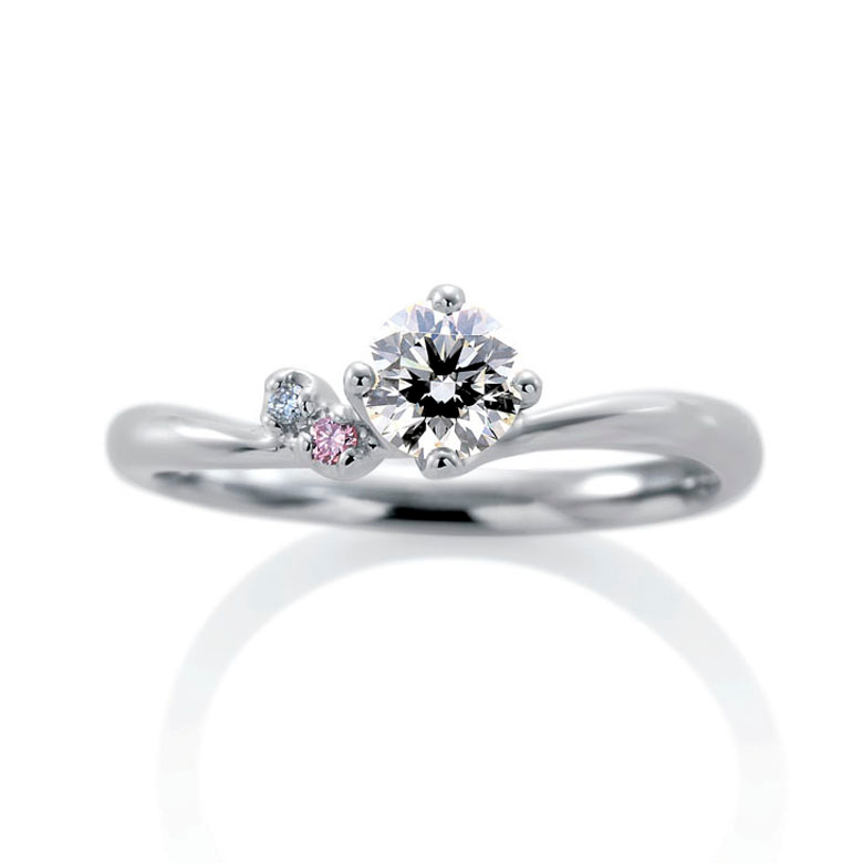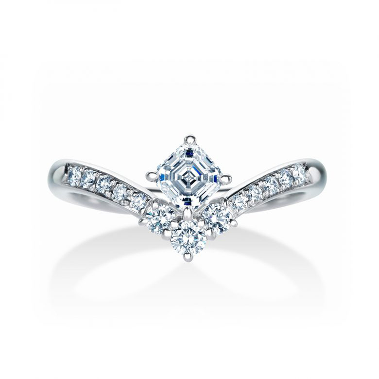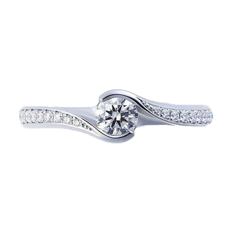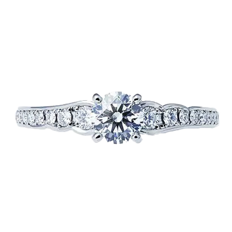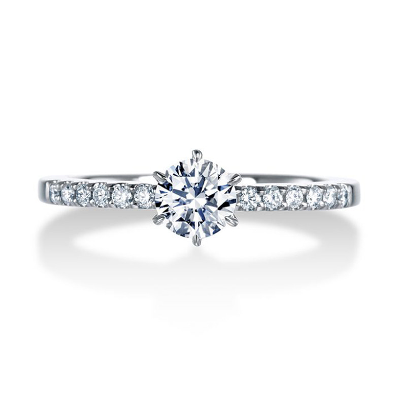 全体の輝きに華を添えるメレダイヤモンドが優しい印象を与え、センターダイヤモンドを一層引き立たせます。